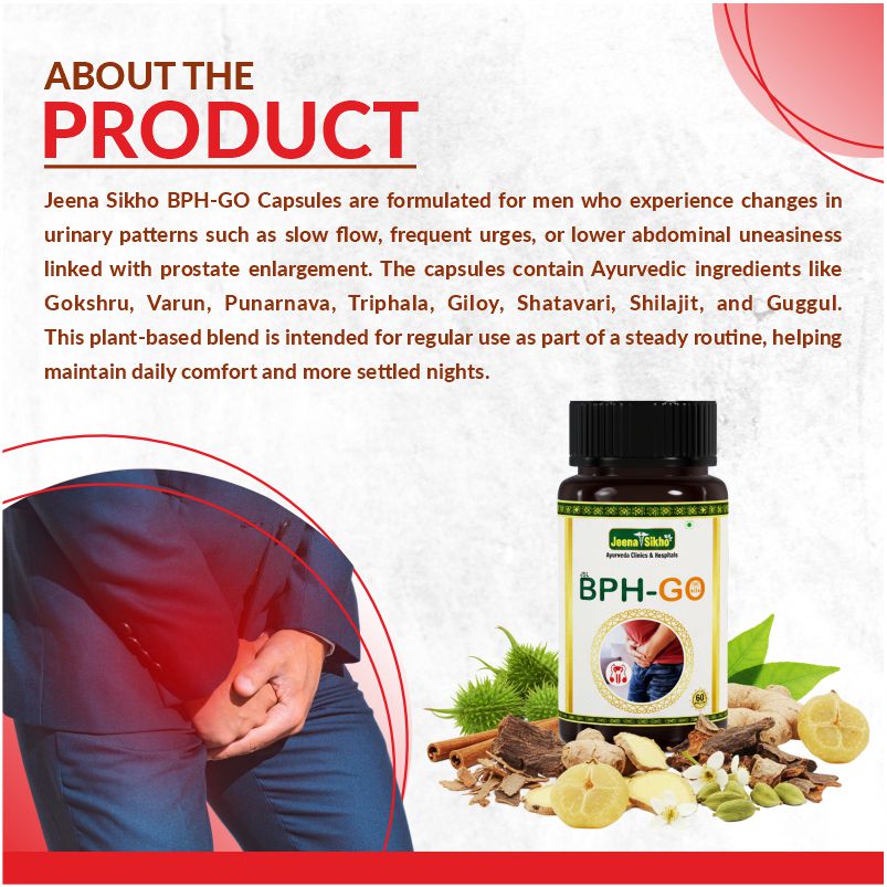 Jeena Sikho BPH GO Capsules are handcrafted Ayurvedic supplements designed to enhance men's health. Formulated with potent herbs like Gokshru, Chitrak, and Dalchini, these capsules may improve vitality, boost immunity, and support digestion.
