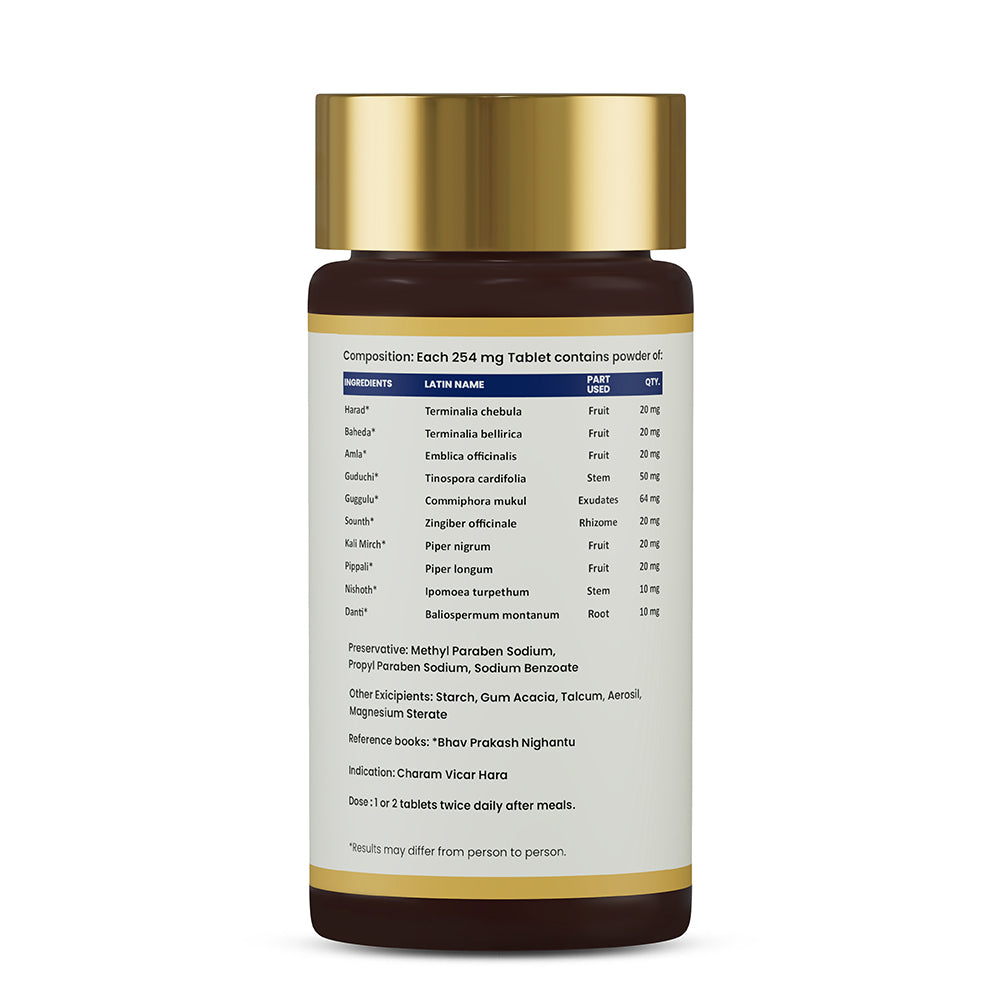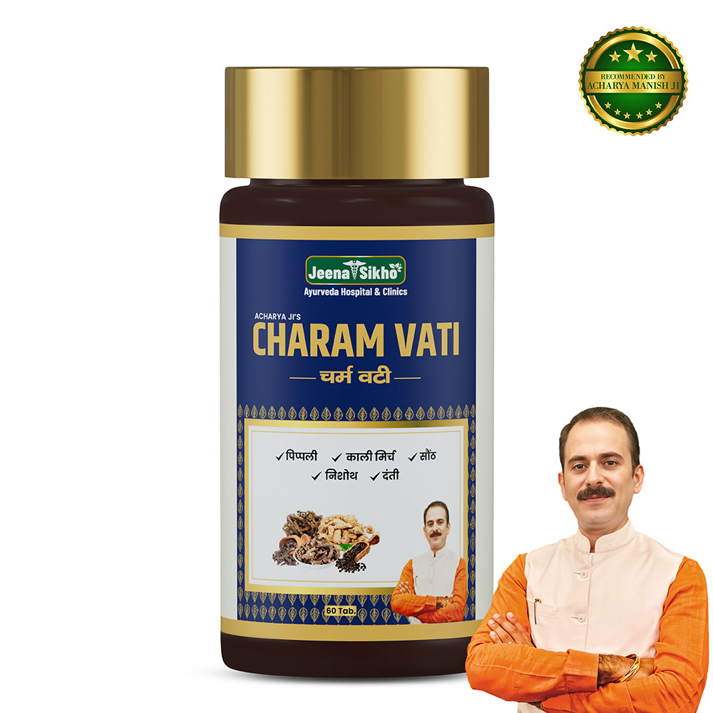 Charam Vati is an Ayurvedic herbal blend specially crafted to support healthy skin and gentle detoxification. The combination of Harad, Baheda, Amla, Guduchi, Guggulu, Sunthi, and Pippali works from within to help manage common skin concerns like acne, eczema, and allergies. The formulation helps maintain the natural balance of the body, encourages internal cleansing, and supports glowing skin. Regular use can contribute to overall wellness while being gentle enough for everyday consumption.