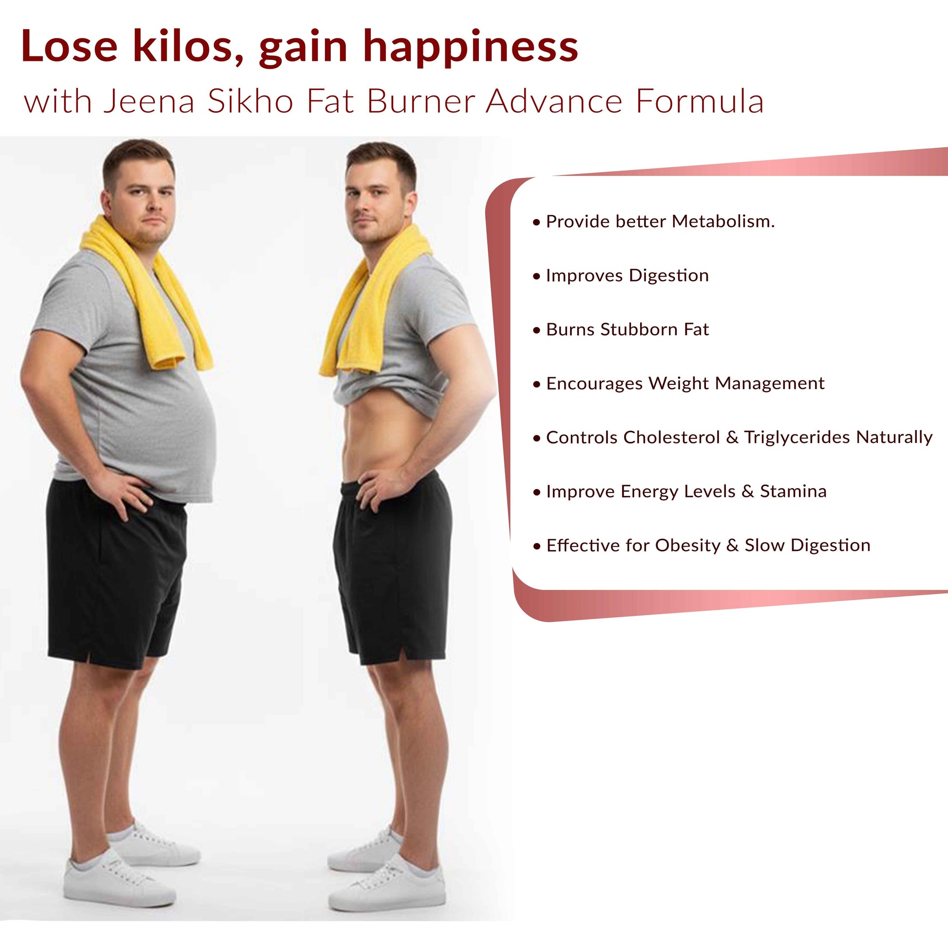 Jeena Sikho Fat Burner Advance Formula is a nutraceutical supplement that is made up of pure herbs and crafted for proper metabolism, improving fat utilisation, and encouraging weight management. It is enriched with Green Coffee Bean, Guggulu, Vrikshamla-like ingredients, and also helps minimise cholesterol, triglycerides, and slow digestion. It is traditionally used for obesity and helps to provide stamina, energy, and healthy weight control.