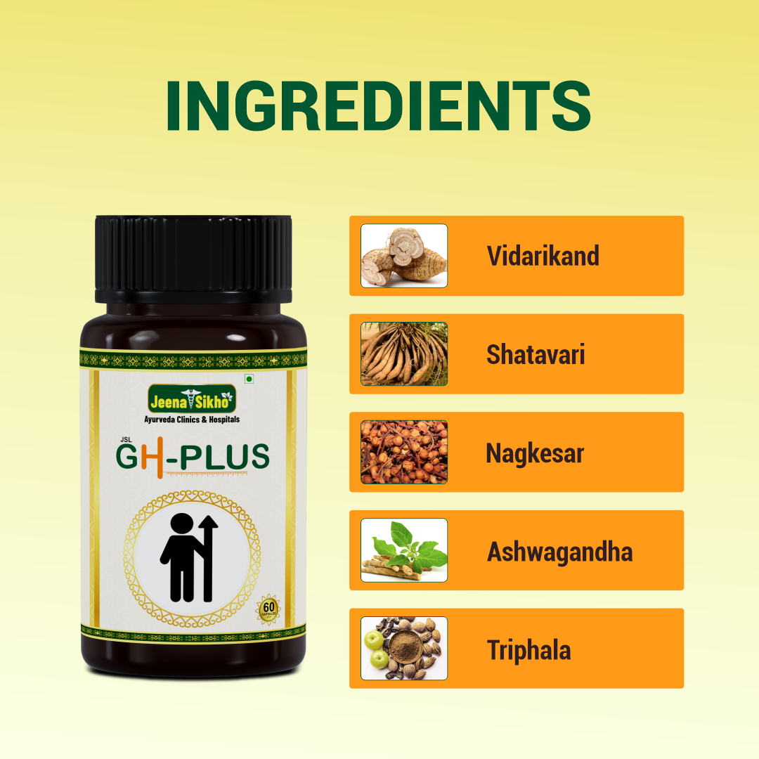 Jeena Sikho GH-Plus Capsules are Ayurvedic supplements that may naturally boost height, strengthen bones, and enhance overall well-being. Enriched with nutrients and antioxidants, they support growth, immunity, and digestion. Made with Halam, Amarbale, and Giloy, these capsules are safe for daily use and promote height gain effectively.