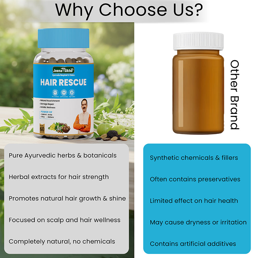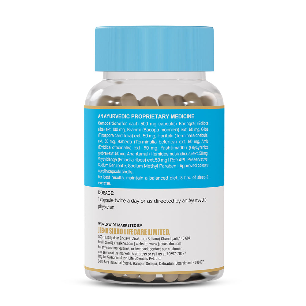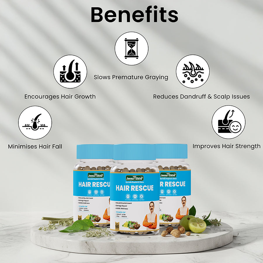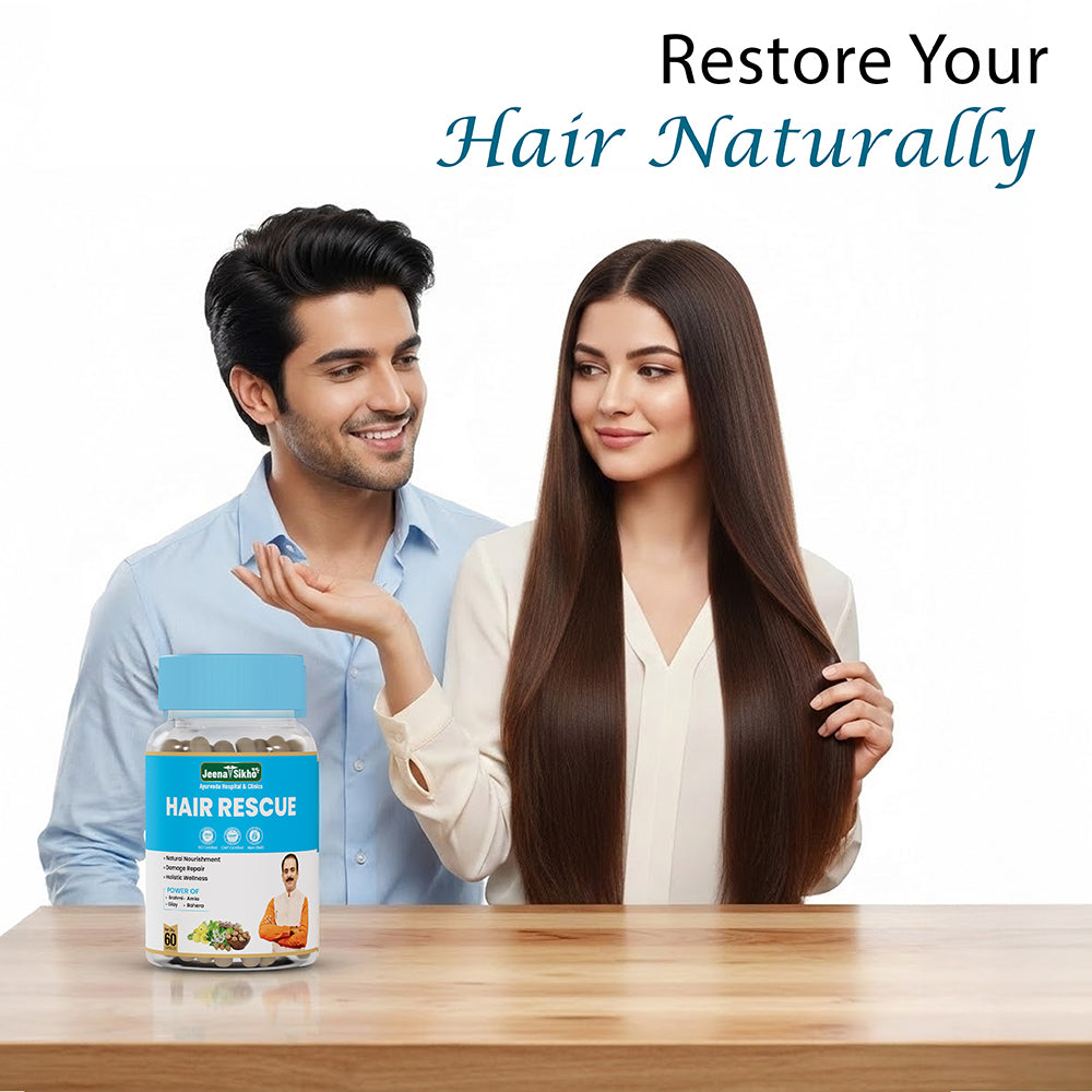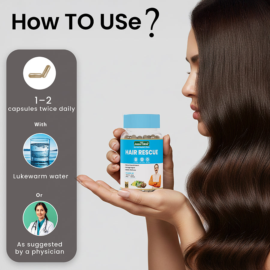 Jeena Sikho Hair Rescue Capsules are a natural Ayurvedic solution for hair fall, premature graying, and scalp issues. Enriched with Amla, Brahmi, Bhringraj, Giloy, Baheda, Yashtimadhu, Anantamul, and Vayavidanga, these capsules work at the root level to strengthen hair, nourish the scalp, and promote healthy growth.