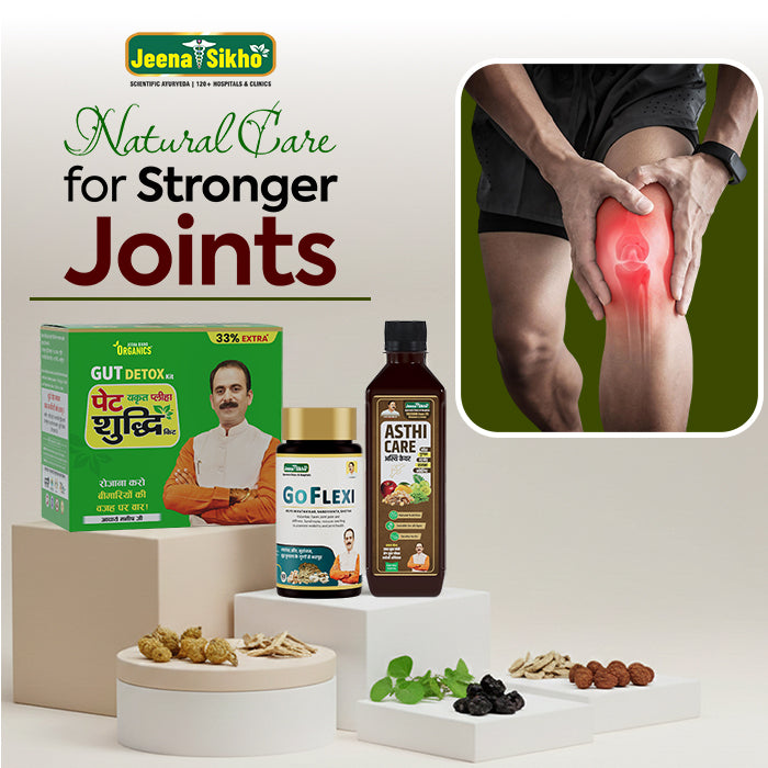 The Jeena Sikho Joint Care Combo is a holistic Ayurvedic formulation designed to support joint health, bone strength, and mobility from within. Asthi Care Juice nourishes bones and joints, Go Flexi Capsules support flexibility and movement, while the Pet Shuddhi Kit helps cleanse the digestive system for better nutrient absorption. Together, they work to ease stiffness, improve movement, and support long-term joint comfort naturally.
