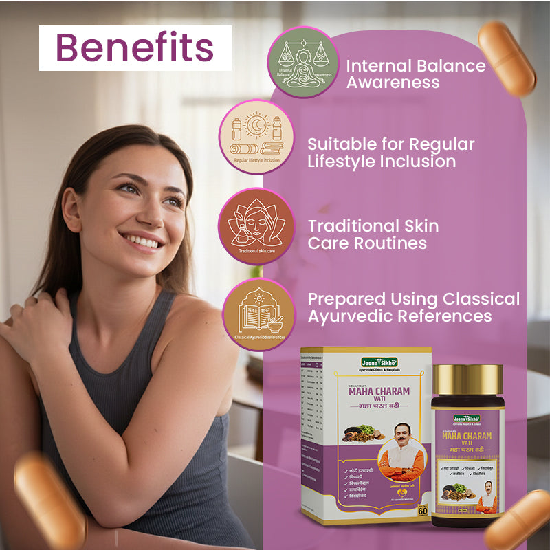 Acharya Manish Ji’s Maha Charam Vati is a gentle Ayurvedic blend of 11 herbs that support clear and healthy skin from within. With ingredients like Neem, Amla, Guduchi, Nagkesar, and Harad, it helps detoxify the body, calm irritation, and reduce common issues like acne, allergies, itching, and eczema. This daily herbal formula supports natural skin healing and promotes balanced, glowing skin over time.