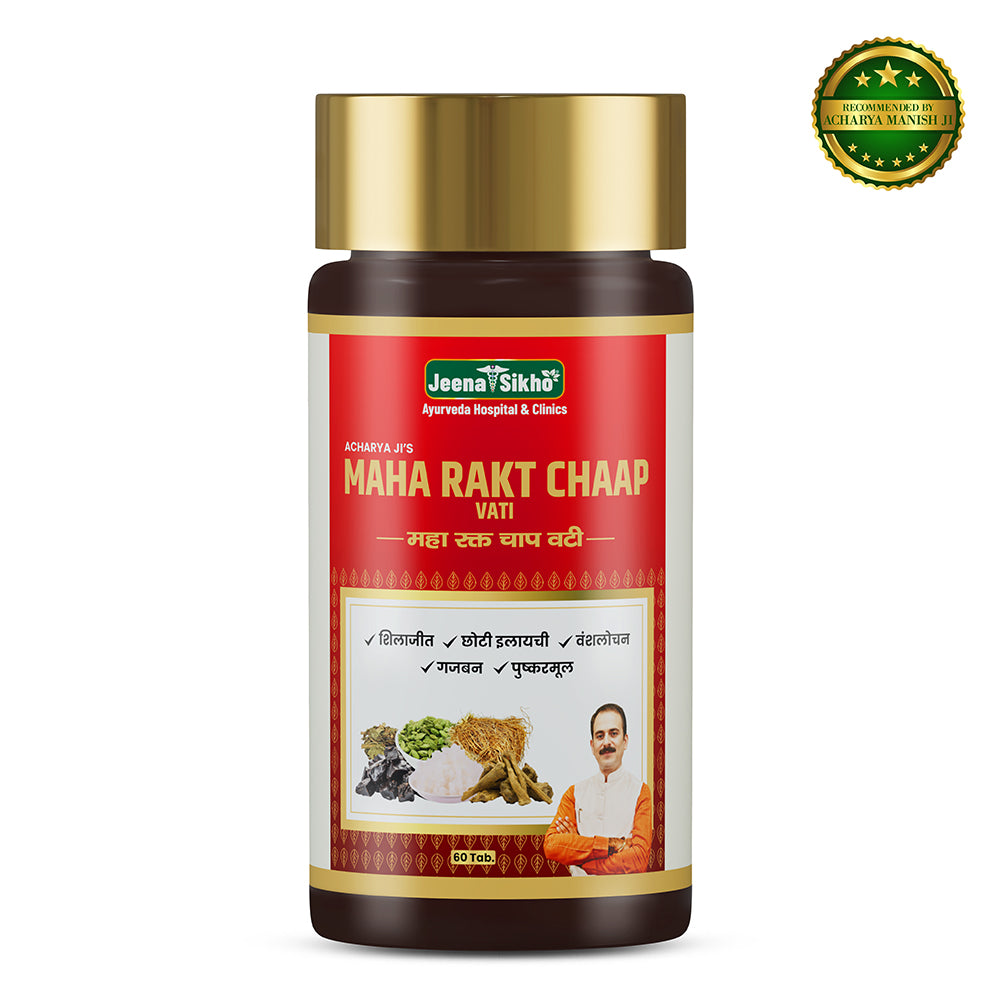 Jeena Sikho Acharya Ji’s Maha Rakt Chaap Vati is a classical Ayurvedic formulation created to maintain healthy blood pressure levels and heart wellness. Enriched with Arjuna, Guduchi, Shilajit, and Pushkarmool, this herbal blend may support smooth blood circulation, strengthen cardiac function, and help reduce internal strain. Prepared using traditional Ayurvedic principles, it offers gentle, long-term support for cardiovascular balance, vitality, and overall well-being.