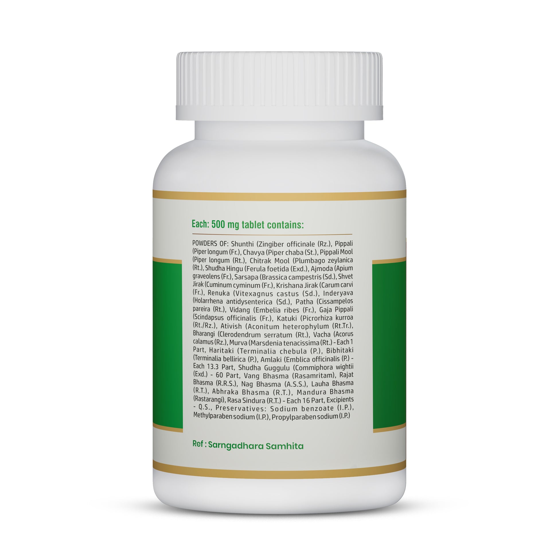 Jeena Sikho Mahayogyraj Guggulu is a powerful Ayurvedic formulation that may maintain digestive wellness. Enriched with natural ingredients, this Ayurvedic digestive health supplement may help lower discomfort support gut health, and overall body harmony. Mahayogyraj Guggulu tablets may help with digestion, ease digestive disturbances, and improve nutrient absorption. Ideal for daily use, this herbal supplement seamlessly fits into your wellness routine.