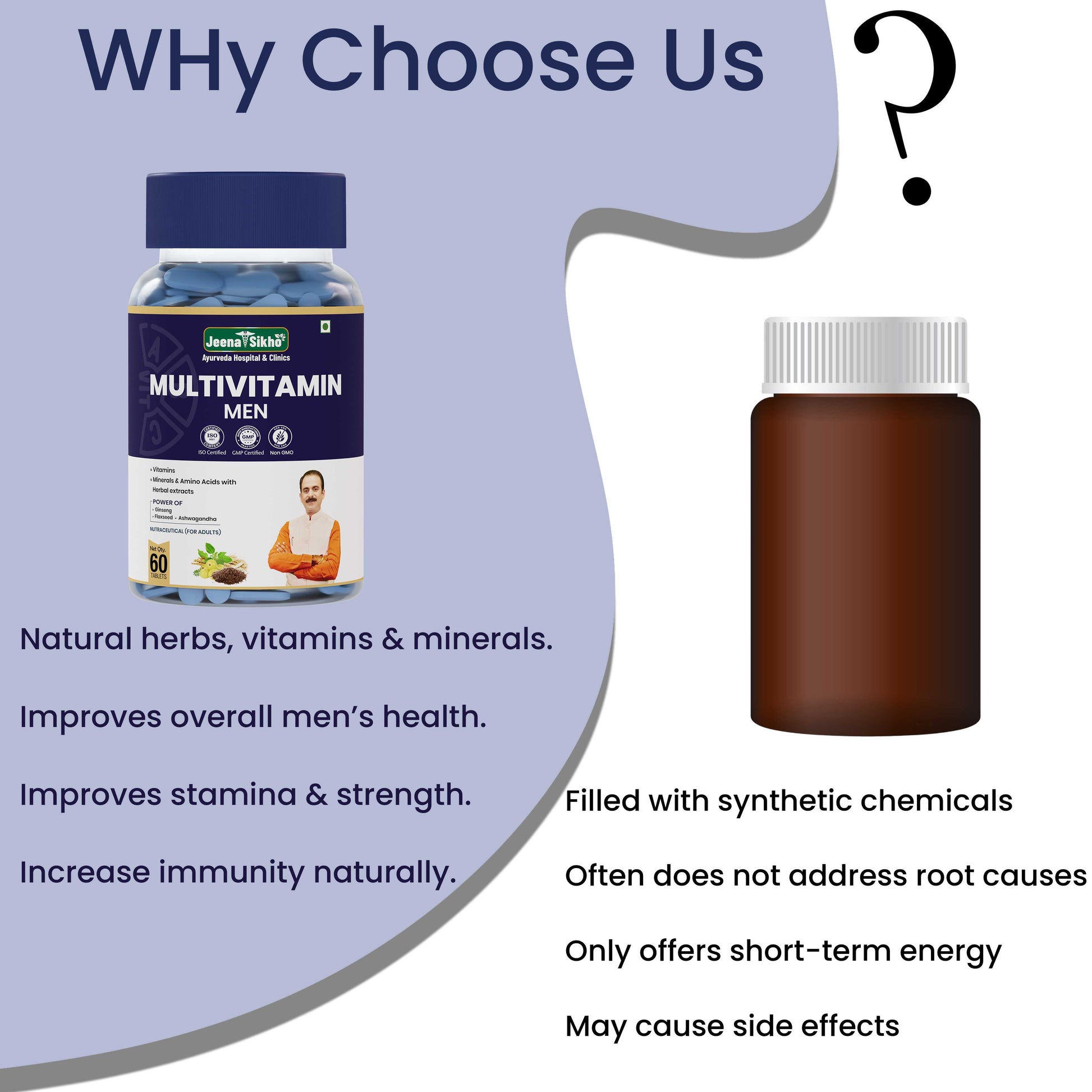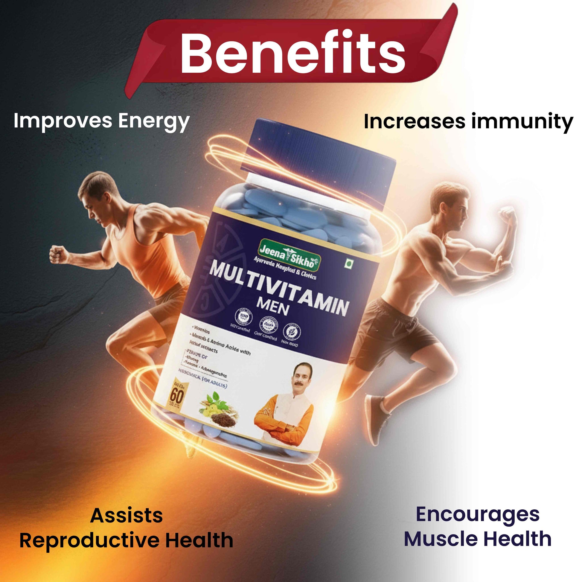 Jeena Sikho Multivitamin for Men is a nutraceutical daily supplement made with vitamins, minerals, amino acids, and herbal extracts like Ginseng, Ashwagandha, and Amla. It helps men stay energetic, active, and healthy. It works on muscle health, immunity, and overall vitality for everyday life.