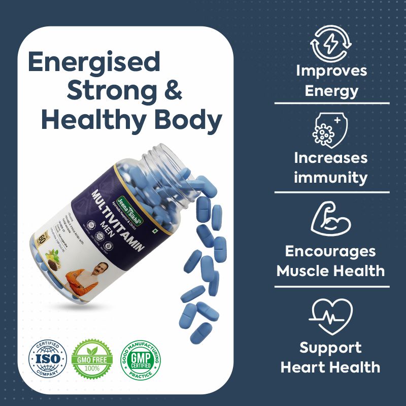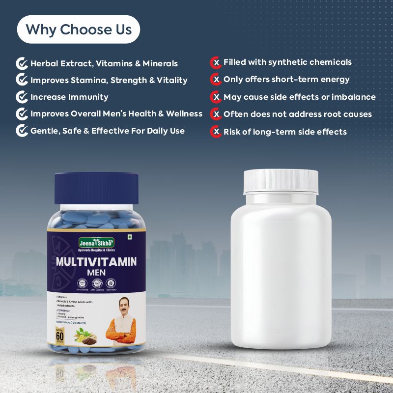 Jeena Sikho Multivitamin for Men is a nutraceutical daily supplement made with vitamins, minerals, amino acids, and herbal extracts like Ginseng, Ashwagandha, and Amla. It helps men stay energetic, active, and healthy. It works on muscle health, immunity, and overall vitality for everyday life.