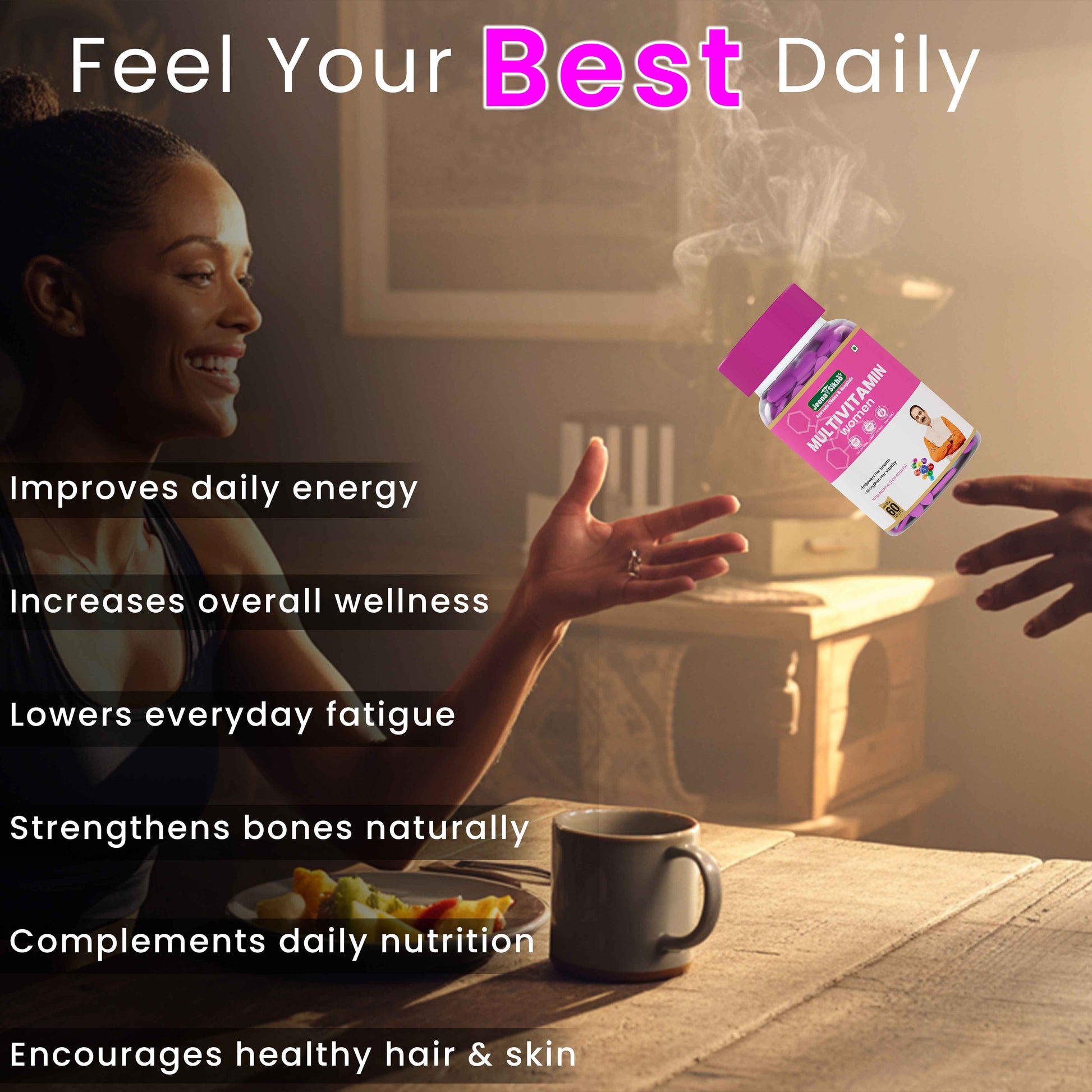 Multivitamin for Women contains B-Complex vitamins and magnesium, which work together to improve energy metabolism.
