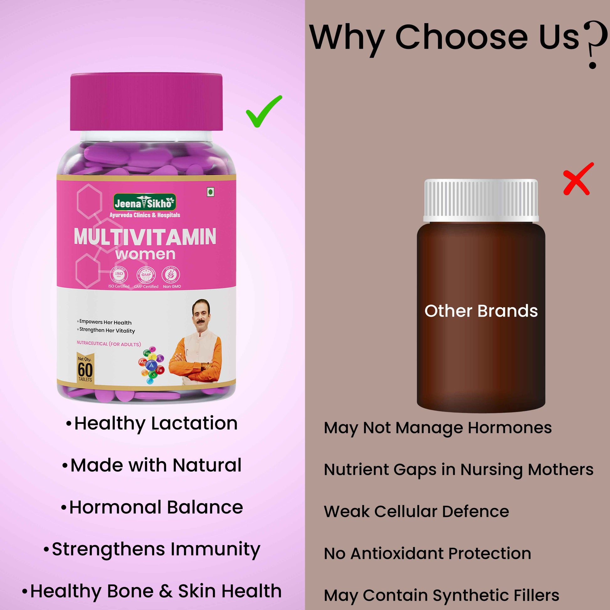 Jeena Sikho Multivitamin Women helps maintain women’s hormonal balance, fertility, immunity, and energy.