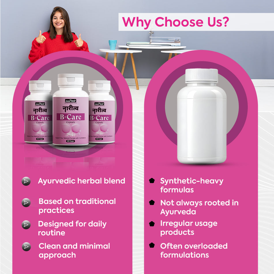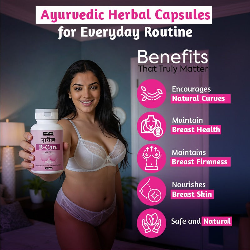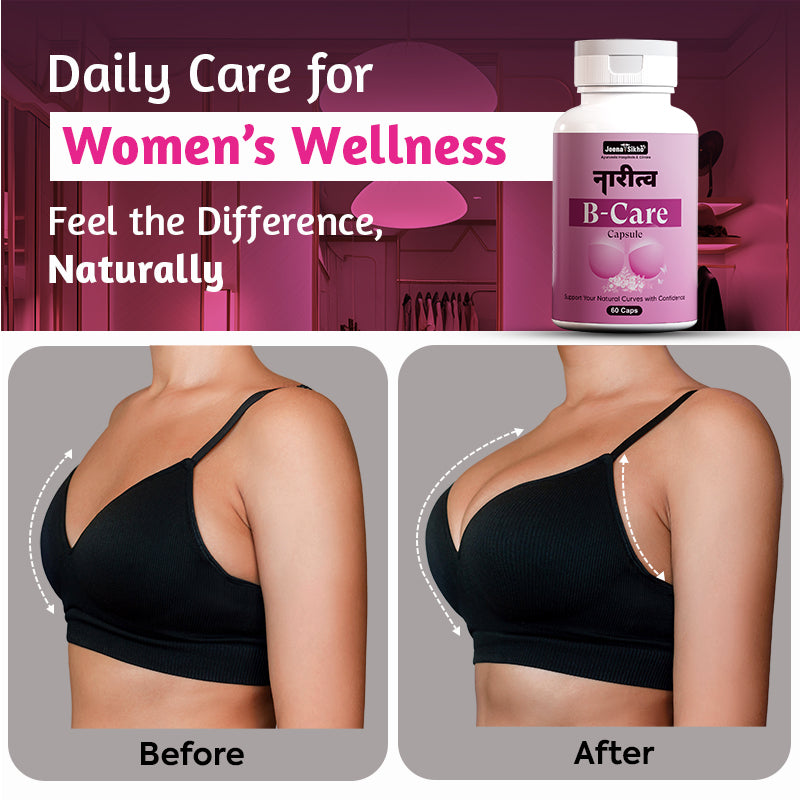Jeena Sikho Naritva B Care Capsules is an Ayurvedic herbal formulation specially designed for women’s health and internal balance. It contains herbs like Shatavari, Ashwagandha, and Aloe Vera, which are traditionally used to support hormones and improve overall well-being in a natural way. The formula works slowly and supports the body without putting extra pressure. It helps maintain energy levels, supports comfort during monthly cycles, and also helps support your natural curves with confidence by improving overall body nourishment and balance. With regular use and a proper daily routine, many women may feel more stable, active, and comfortable in their body.