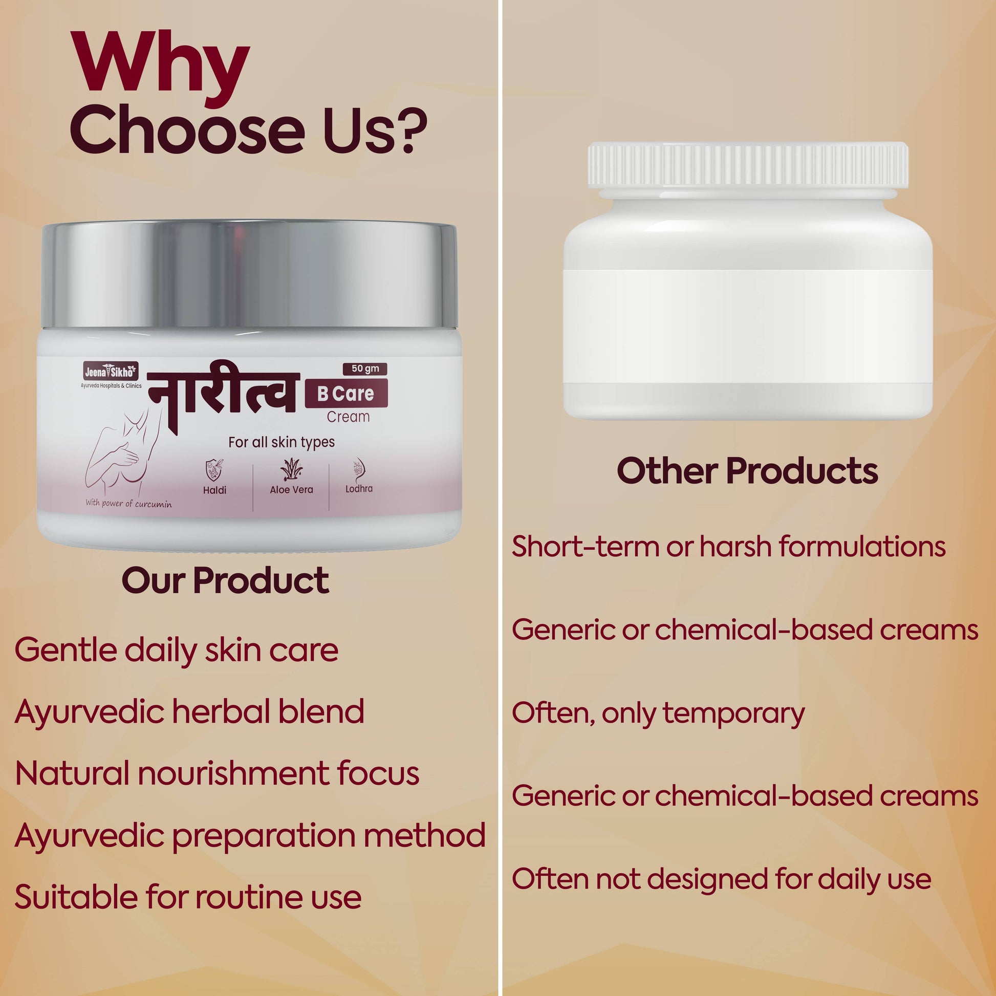 Jeena Sikho Naritva B Care Cream is a carefully formulated Ayurvedic cream designed for natural breast firmness. Enriched with Haldi, Shatavari, Ashwagandha, Lodhra, Aloe Vera, and cooling herbs, this cream may help improve breast firmness and maintain a toned appearance.
