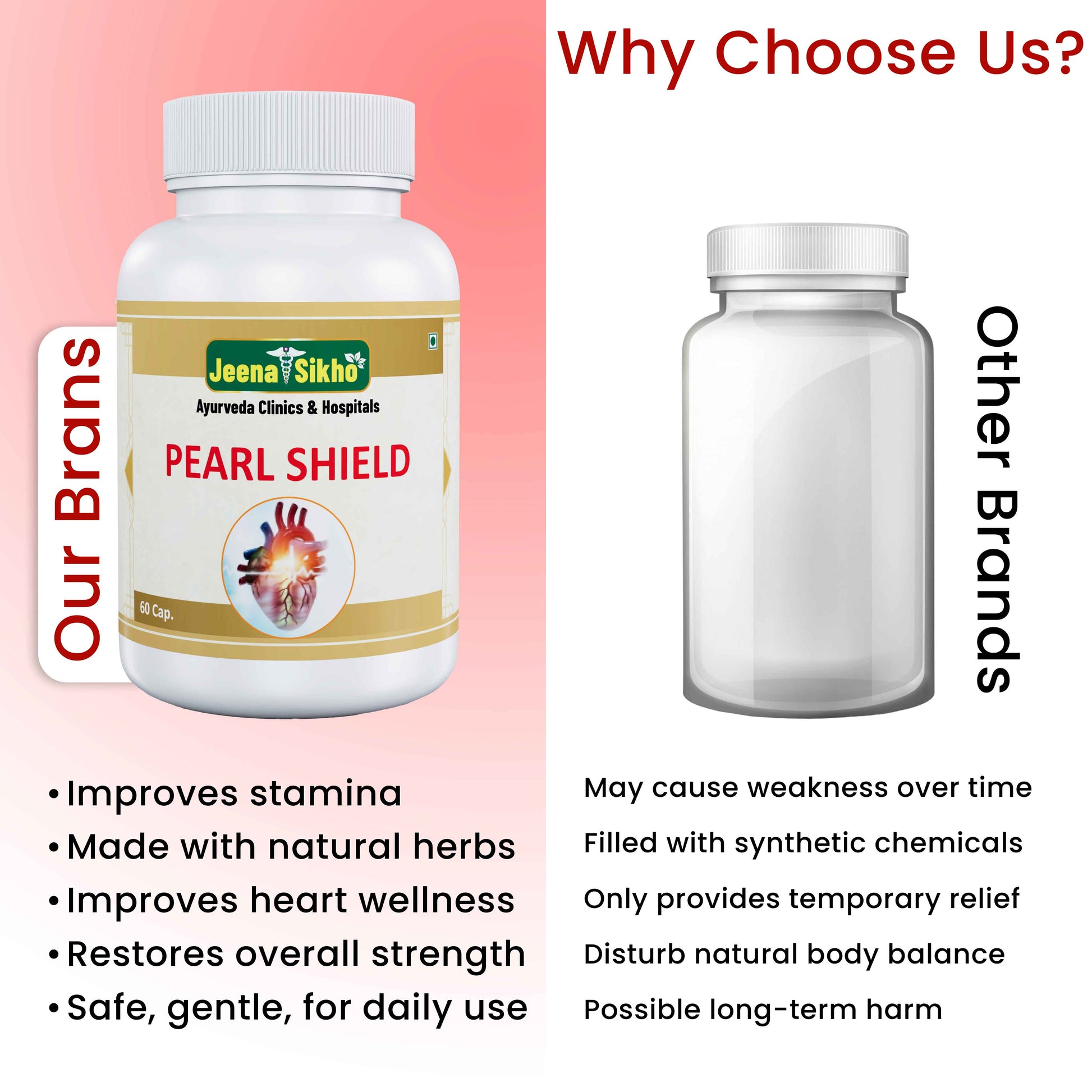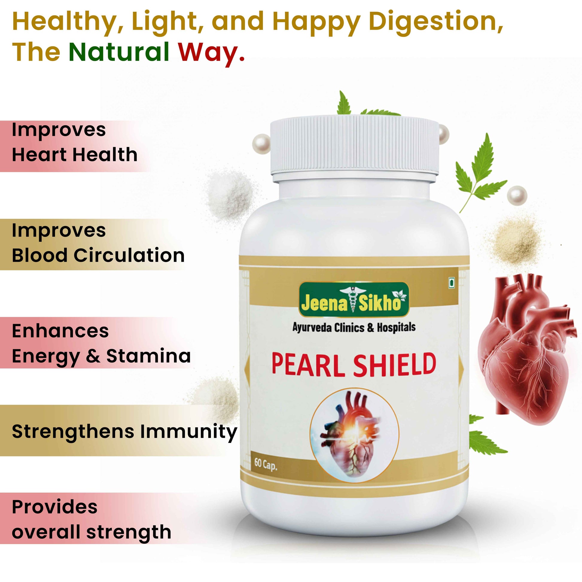 Jeena Sikho Pearl Shield Capsules are Ayurvedic herbal supplement for heart health that promote cardiovascular health, energy levels, and overall well-being. These capsules, which include potent substances such as Satt Giloy, Kamdugha Ras, and Pravaal Panchamrit Ras, may aid in the maintenance of good blood circulation, increase stamina, and protect the heart from oxidative stress. Pearl Shield Capsules, which are made with natural and chemical-free ingredients, are safe for everyday use and may help you live a healthier and more active lifestyle.
