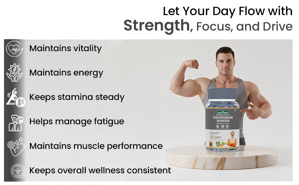 Jeena Sikho Testo Booster Advance Formula blends Ashwagandha, Gokhru, Korean Ginseng, Black Pepper, and other beneficial herbs. Made for men, it may help maintain stamina, steady energy, and vitality. The formula might encourage lean muscle performance, endurance, and confidence, helping daily activities feel more active, balanced, and consistent.